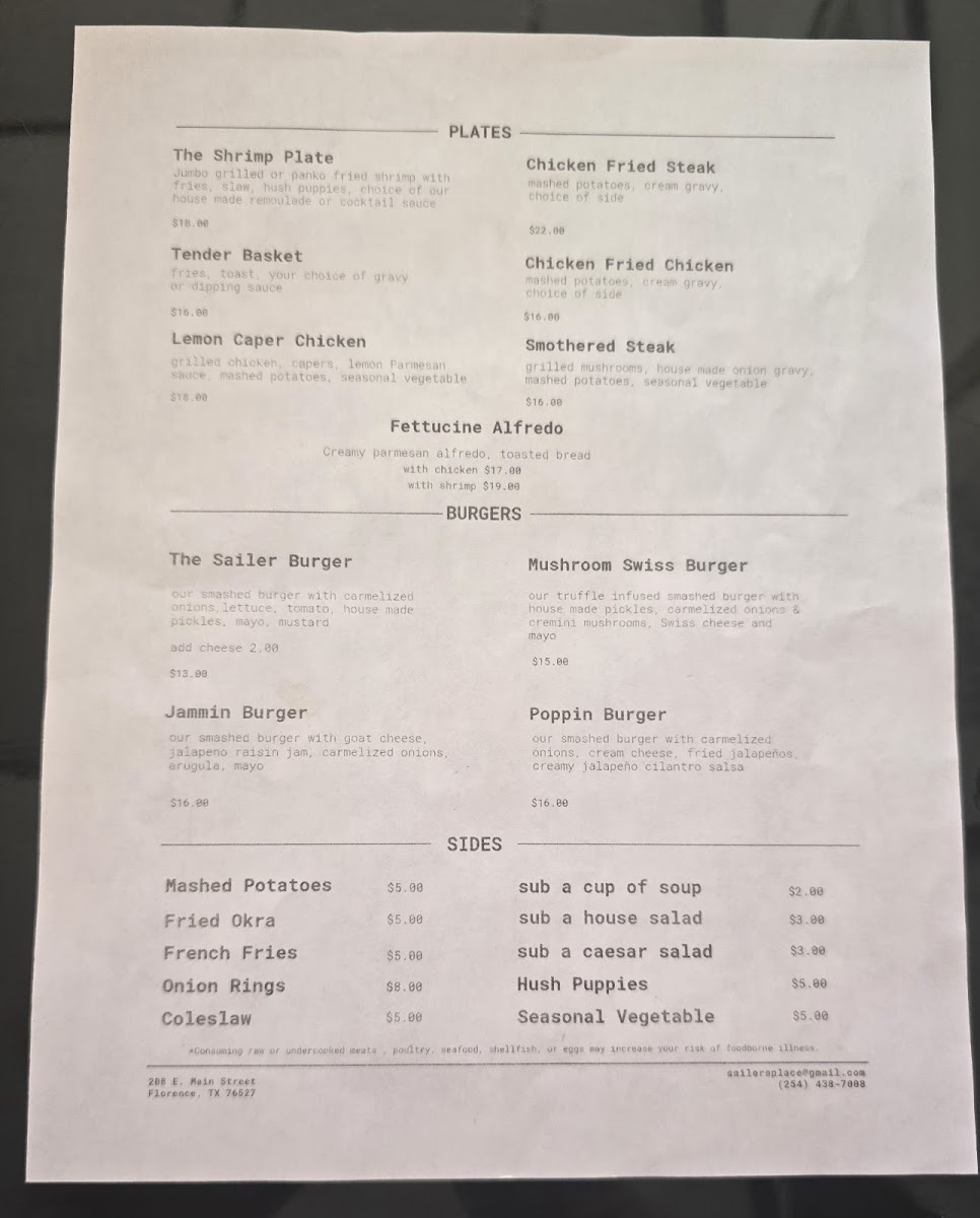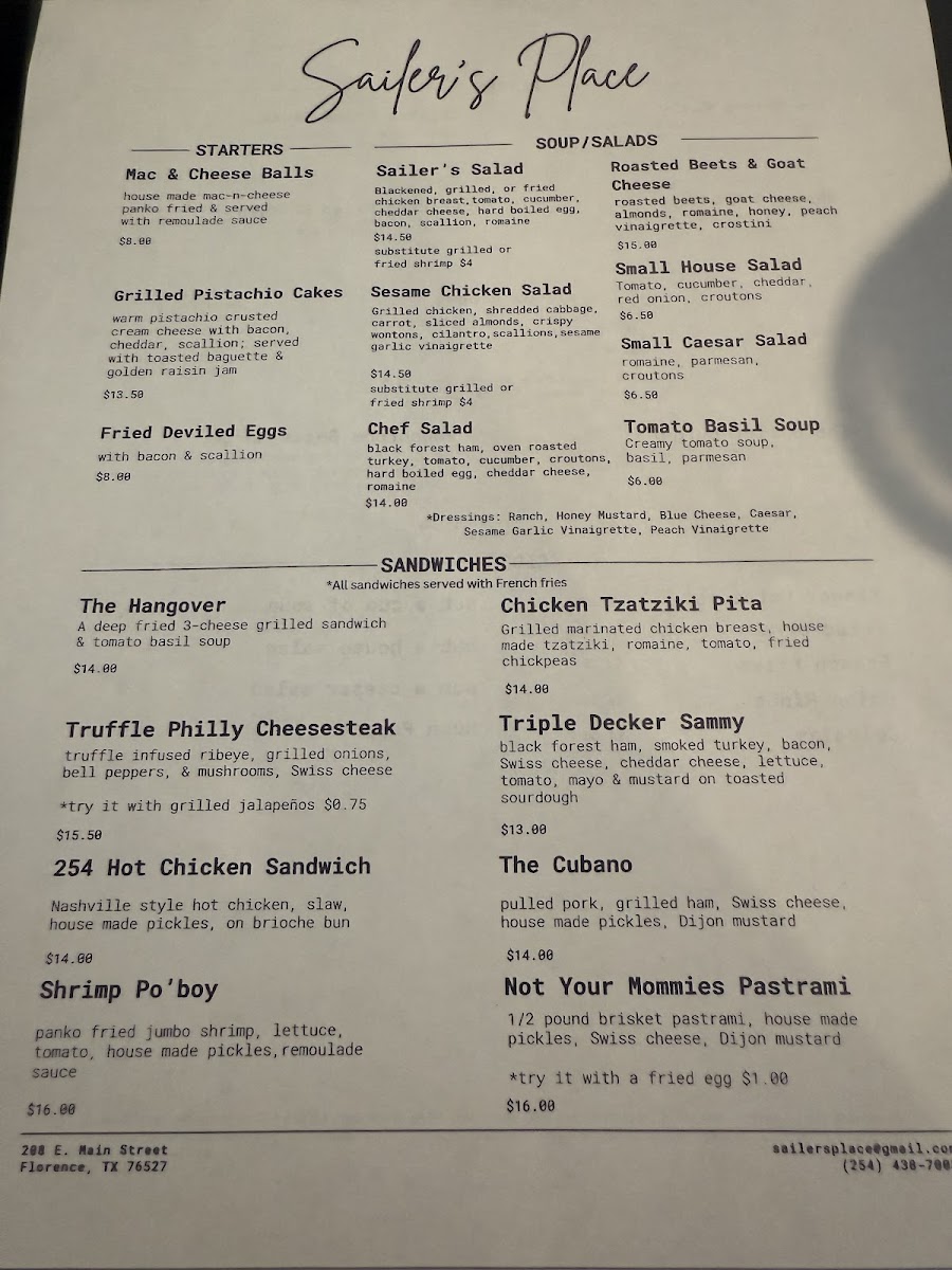 Visitors can also choose from the Soup and Salads category, which includes several salad varieties such as Sailer's Salad, Roasted Beets & Goat Cheese, Market Salad, Chef Salad, along with smaller portions like Small House and Small Caesar Salads. Additionally, a Tomato Basil Soup is available, catering to those looking for lighter or healthier meal options.